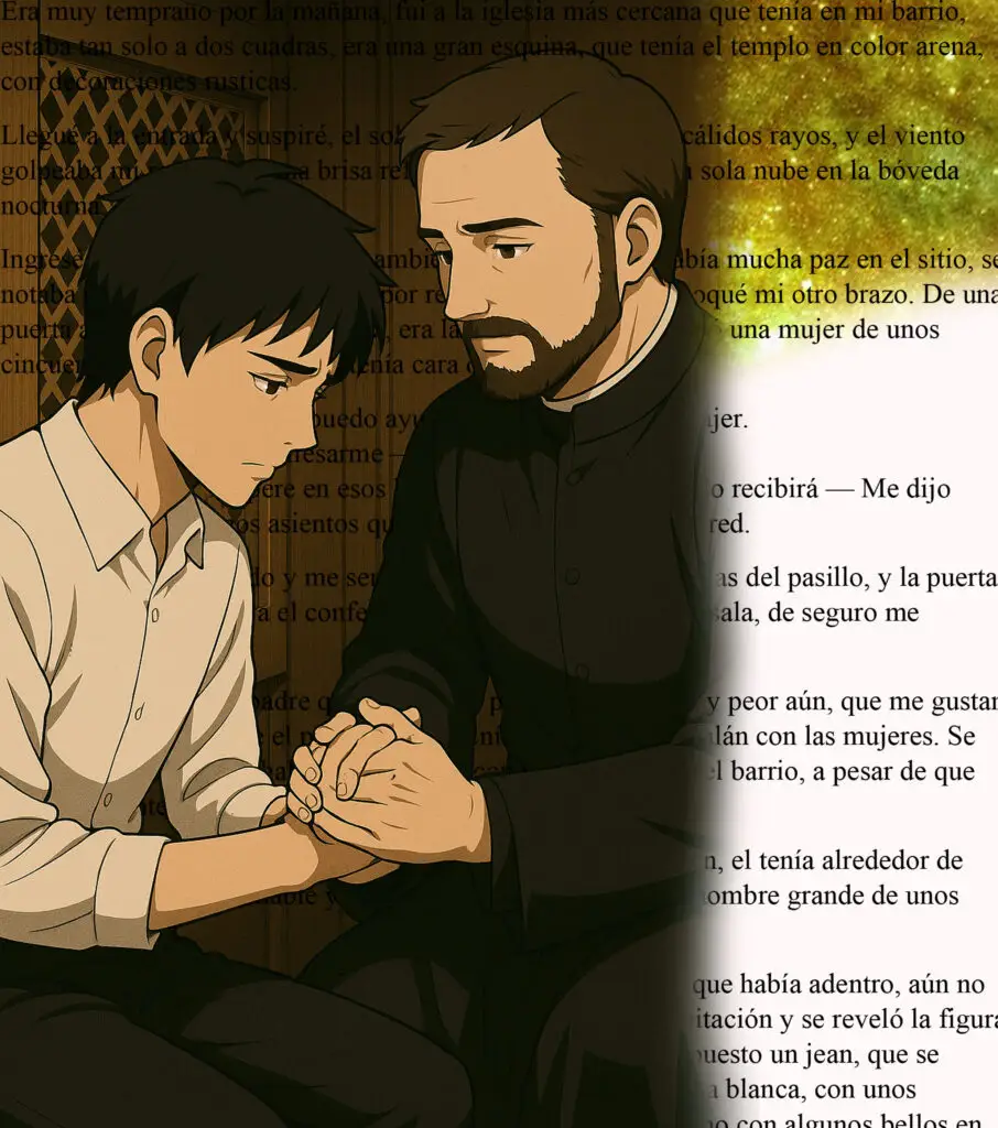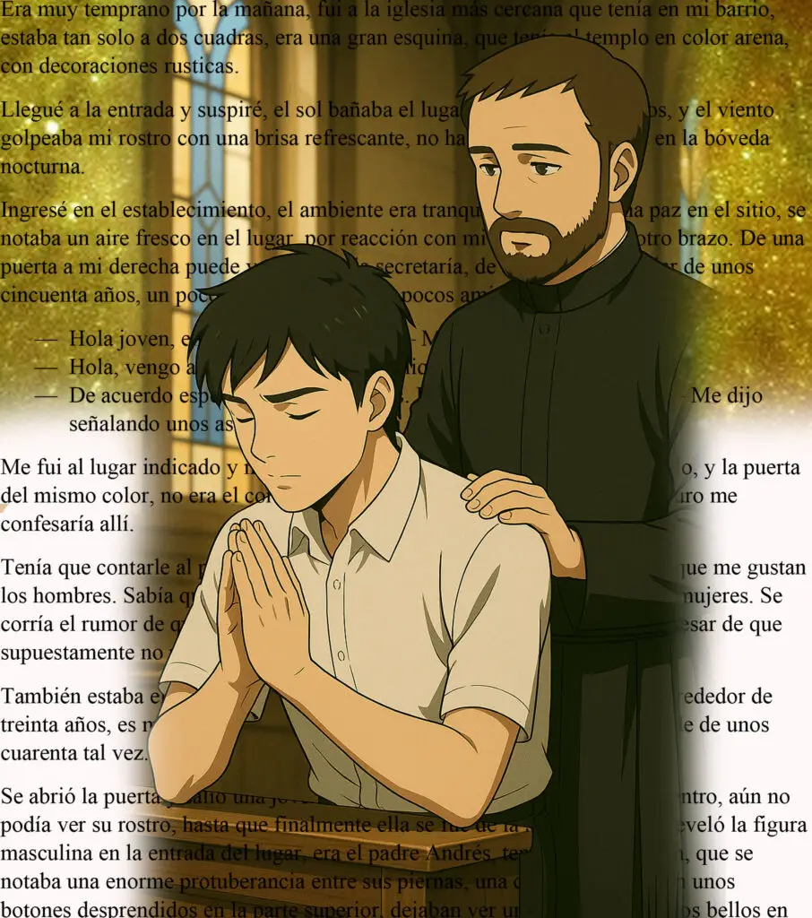 En el corazón de una iglesia silenciosa, un joven común carga con el peso de sus deseos ocultos. Llega dispuesto a redimirse, a vaciar el alma en busca de perdón. Pero al ingresar al confesionario, lo que encuentra no es solo un oído comprensivo… sino una voz grave, cálida y perturbadoramente seductora.