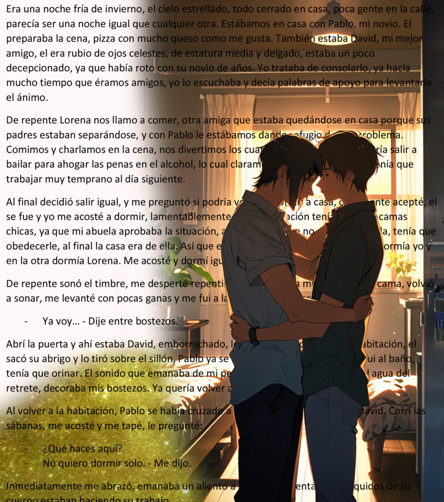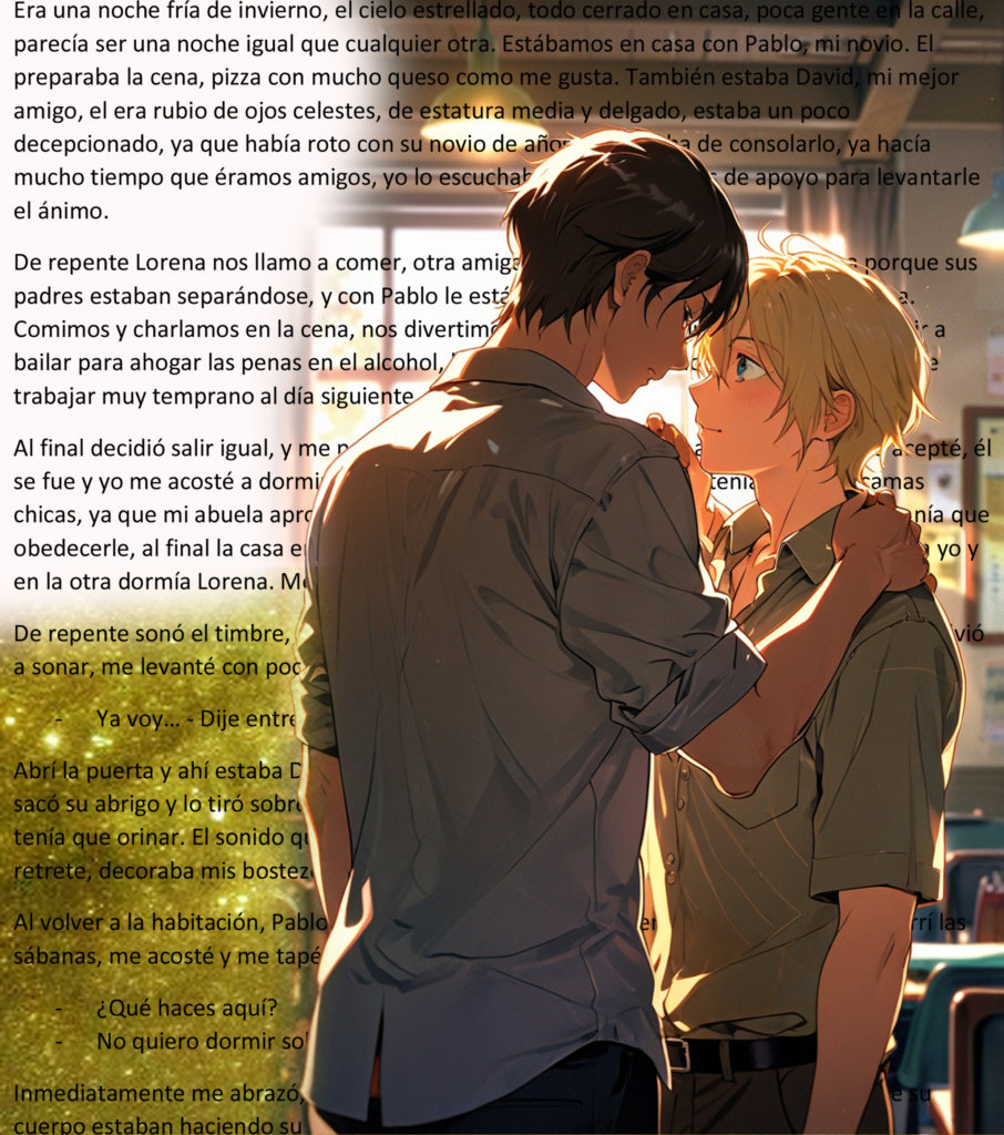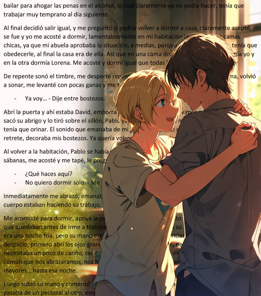 Después de una intensa pelea con su novio de años, mi mejor amigo decidió salir a divertirse solo, por cuestiones laborales no podía acompañarlo, lo que no sabía era que buscó consuelo en el fondo de una botella. La noche se convirtió en un torbellino de emociones y risas desinhibidas, volvió a dormir a casa, no quería quedarse en su habitación y sin compañía, decidió acostarse en mi cama, yo pensé que él necesitaba un poco de contención, pero sus acciones fueron llevando a una serie de decisiones audaces. El alcohol había desatado en él una curiosidad insaciable por lo desconocido. Lo que comenzó como un intento de olvidarse de la separación, se transformó en una noche de descubrimientos apasionados, donde los límites se desdibujaban y el deseo se convirtió en el protagonista de una historia que cambiaría nuestras vidas para siempre.